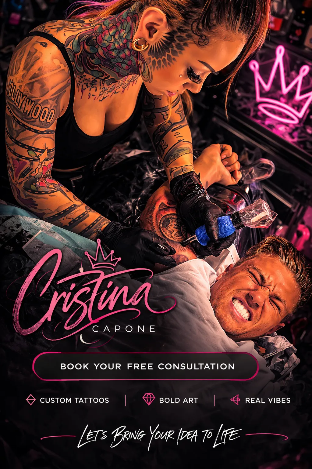 Cristina Capone is a dedicated tattoo artist who believes every tattoo should tell a story. She is passionate about creating custom work that reflects each client’s individuality while maintaining strong artistry, detail, and flow. Known for her welcoming energy and good vibes with commitment to quality, Cristina makes the tattoo experience feel collaborative, comfortable, and exciting from start to finish.